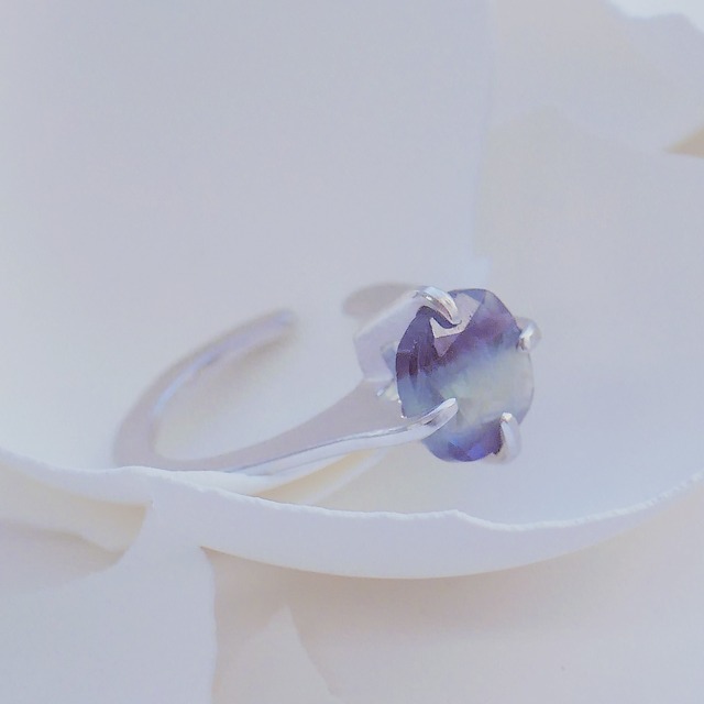 素材:Silver925(K18GP、ニッケルフリー)、フローライト 宝石サイズ:W8mm D10mm H5mm位 商品サイズ:11〜15号 (自作のフリーリング13号を基準に± 2号調整) 石言葉:発想力 お届け時期の目安:ご注文いただいてから生産を始め1ヶ月〜1ヶ月半でお届けしております。在庫状況やイベントスケジュールにより、2ヶ月ほどお時間を頂戴する場合もございますので、あらかじめご了承ください。 座を付けず、爪で宝石を留め、宝石の露出面を増やしたリング。 宝石が見える面積が大きいため、室内・室外問わず、美しく煌めきます。 上品さを保ちつつ、より宝石の存在感が欲しいと感じたことがあるかもしれません。 側面のカットも美しく、どの角度からでも気品ある美しさを放つリングは、大人の上品さと宝石の華やかな存在感、両方を兼ね備えています。 立体感がある設計のため、重ね付けをしなくとも、手元を華やかに仕上げてくれるリングです。 ▽各宝石の個性をお楽しみください。 天然石だけでなく、合成石もロットにより色の個性がございます。 内包物の違いなど、それぞれの個性が唯一無二の宝石の美しさを作りだします。 一つ一つデザイナーが手作業でお作りしておりますので、 僅かな傷や歪みがあることがございますが、不良品ではなく クラフトマンシップの特徴の一つとして、あらかじめご了承くださいませ。 ▽お手入れ方法 使用後は研磨剤が入っていない柔らかい布でお拭きください。 水に強い宝石もございますが、当ブランドでは水を出来る限り避けていただくことを推奨しております